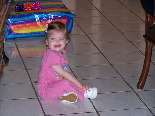 She's still been learning all sorts of new things lately, even with not feeling good! She can now take about 7-8 steps on her own, when she feels like it. Most of the time she still just drops to her knees, though! She's trying SO hard to be able to put on her socks and shoes all by herself. And when she first wakes up in the morning, she's immediately calling for her daddy. I love it! Now HE gets to be the first one up out of the bed! :)